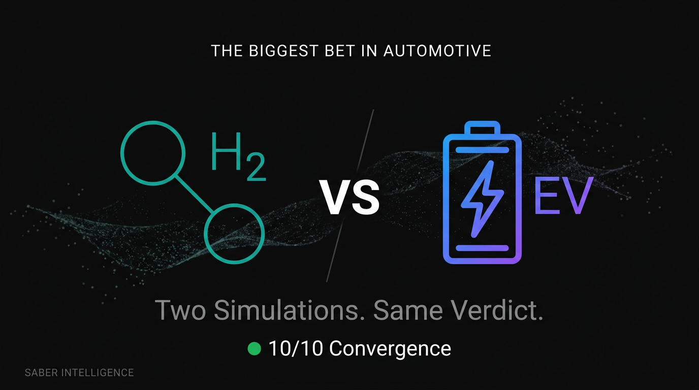 The numbers tell a stark story even before simulation. BEV battery costs have fallen to $108/kWh globally ($84 in China), approaching the $100 tipping point for ICE cost parity. Green hydrogen sits at $3-6/kg with targets of $1/kg that have not been met. There are 5 million public EV chargers worldwide vs roughly 1,200 hydrogen stations.